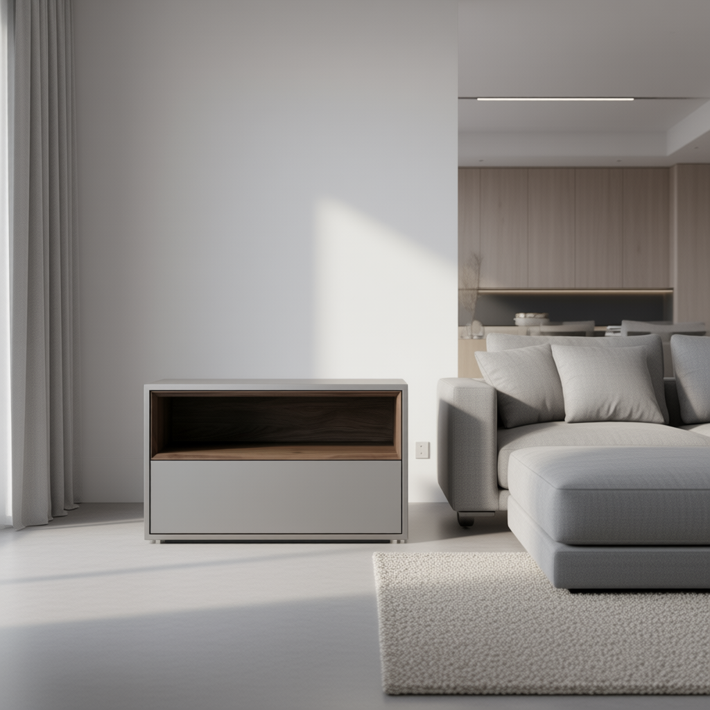 Embrace understated elegance with our Contemporary Minimalist Side Table. Crafted from high-quality 19mm (3/4″) MDF, this side table features a sleek, clean design perfect for modern living spaces. The push-to-open mechanism provides a seamless, handleless aesthetic, while the spacious interior offers convenient storage. Its robust construction ensures lasting durability. Dimensions: Length 80cm, Depth 40cm, Height 75cm.